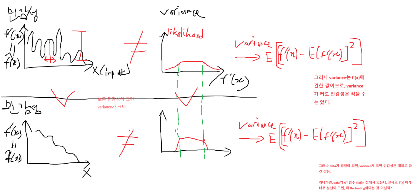 dataset이 고정되어 있으면, variance가 크면 보통은 민감도가 크다. (물론 overfitting regime에서의 말임. underfitting에서의 variance가 크다는 것은 학습이 안되었기 때문에 variance가 크다는 것.)