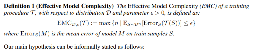 이 EMC는 data distribution과, classifier의 architecture에 종속적일 뿐만 아니라, 훈련 과정(training procedure)에도 영향을 받는다. (예를 들어서, training time을 늘리면 EMC도 증가한다.)