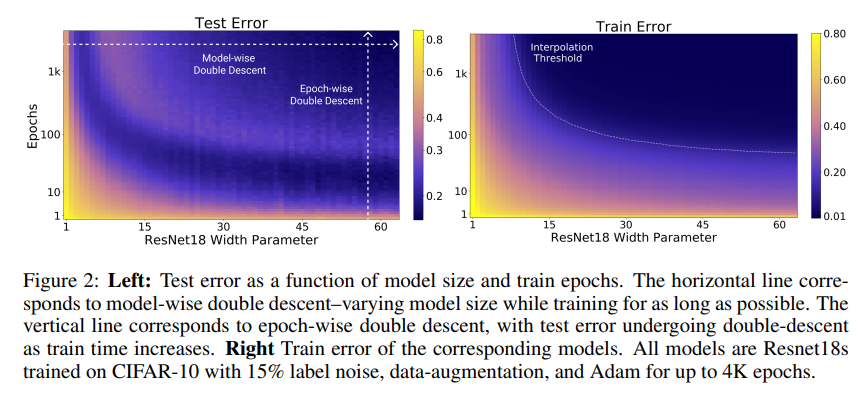 결국 double descent curve를 보았을 때, x축을 resnet의 width(channel)수, 즉 parameter 수라고 했을 때, 여기서도, epoch을 고정시키면, double descent curve가 나타나고,