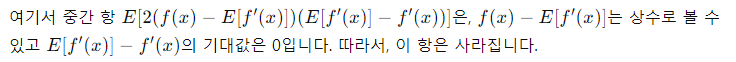 3. 그렇다면 왼쪽 식(E[(f(s) - f’(x))^2]은, 어떻게 bias^2 + variance가 되냐면,