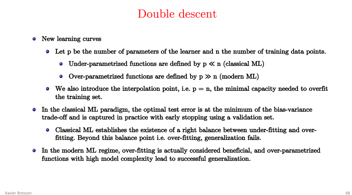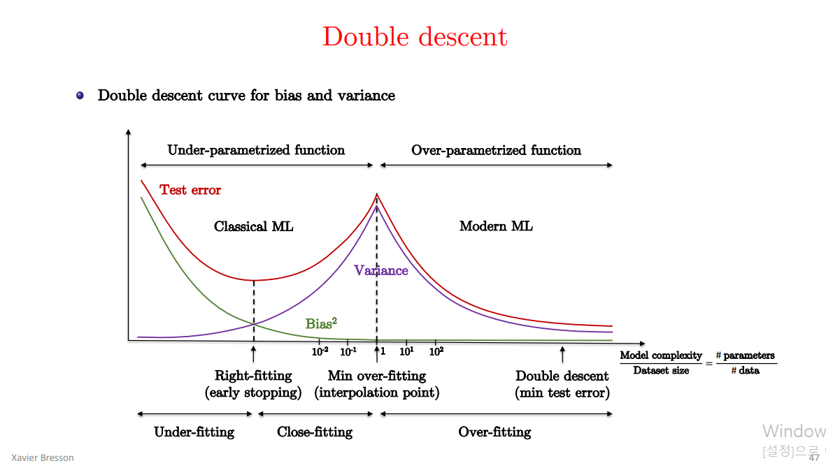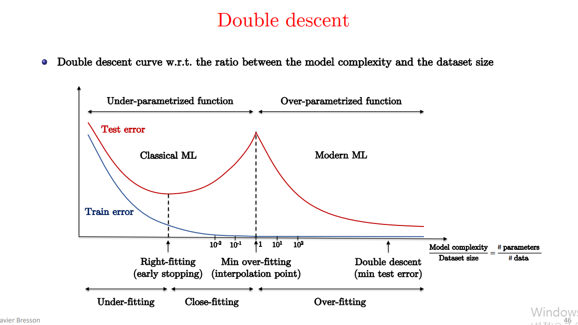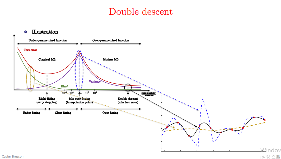 근데 model complexity가 sample의 개수보다 엄청 커지면, 그래서 training error를 0으로 만들 수 있따면, test error가 0으로 가게 된다. 그래서 더 큰 모델이 더 좋게 된다. 이것이 2018년 belkin이 처음 제시한 double descent curve다.