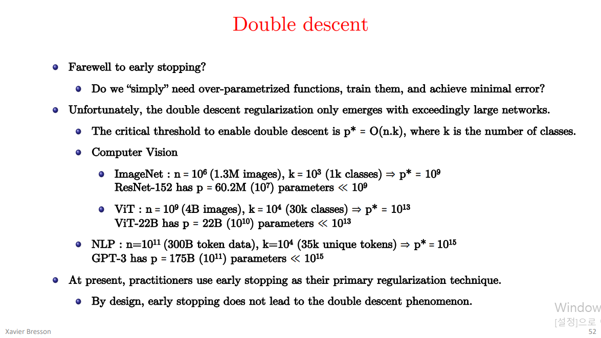 기존의 ML 연구자들은 더 큰 모델은 안좋은 성능을 낸다고 생각했었는데, 근데 실용적인 엔지니어들은, 모델은 크면 클수록 좋다는 생각을 하게 되었다. 그러나 중요한 것은, 특정 setting에서는 early stopping을 하면 test accuracy가 좋게 나오고, 어떤 setting에서는 zero training error까지 도달하도록 training을 시켜야 performance가 잘 나왔다는것이다. 그럼에도 불구하고, 전통적인 통계학자들과 DL practitioner들이 둘다 동의하는 것은, data가 더 많을수록 더 좋다는 것은 합의된 내용이다.