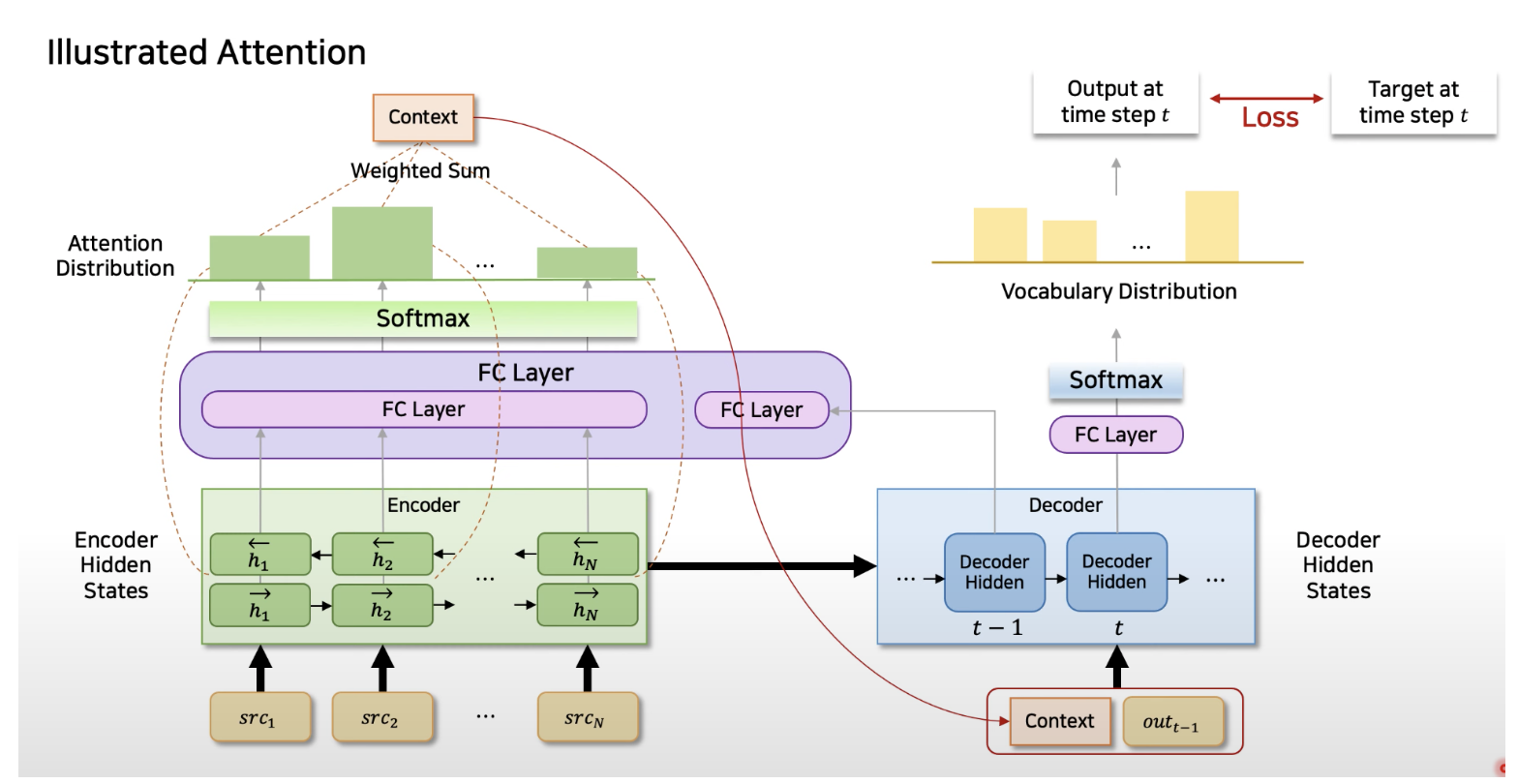 근데 여기서는 이렇게 아키텍쳐가 나온다. encoder가 그냥 hidden vector만 출력하는 것이 아니라, output을 출력을 한다. 그래서 이거를 fc layer를 통과시키고, softmax를 하면 이제 이거를 context라고 부르고,