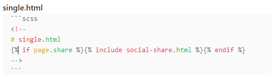 이런 식으로 single.html 파일이 구성되어있는데, if page.share는 share 변수가 true이면, social-share.html 파일을 화면에 추가하게 된다.