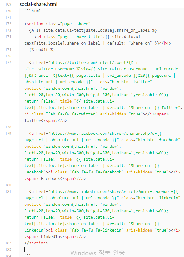 social-share.html 파일은 다음과 같이 되어있다. (느낌상 layout (scss)와 관련된 html 파일들을 _layout 폴더에 있고, layout이 조건에 따라서 추가/추가하지 않는 html 출력 버튼/정보들에 대해서는 _includes에 있는 것 같다.)