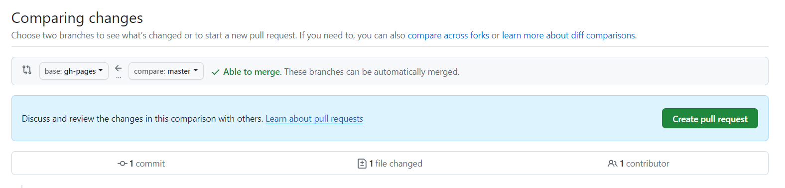 그 상태에서, 위 사진과 같이, master에 있는 변화를, gh-pages 에 적용한다고(gh-pages <- master), pull request tab에서 적용해주고(만약에 master <– master 로 설정되어있으면, compare across forks를 통해서 바꾸어준다.) pull request 하면, contribution에 기록되게 된다.