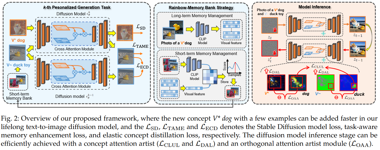 abstract:: Text-to-image generative models can produce diverse high-quality images of concepts with a text prompt, which have demonstrated excellent ability in image generation, image translation, etc. We in this work study the problem of synthesizing instantiations of a user’s own concepts in a never-ending manner, i.e., create your world, where the new concepts from user are quickly learned with a few examples. To achieve this goal, we propose a Lifelong text-to-image Diffusion Model (L2DM), which intends to overcome knowledge “catastrophic forgetting” for the past encountered concepts, and semantic “catastrophic neglecting” for one or more concepts in the text prompt. In respect of knowledge “catastrophic forgetting”, our L2DM framework devises a task-aware memory enhancement module and a elastic-concept distillation module, which could respectively safeguard the knowledge of both prior concepts and each past personalized concept. When generating images with a user text prompt, the solution to semantic “catastrophic neglecting” is that a concept attention artist module can alleviate the semantic neglecting from concept aspect, and an orthogonal attention module can reduce the semantic binding from attribute aspect. To the end, our model can generate more faithful image across a range of continual text prompts in terms of both qualitative and quantitative metrics, when comparing with the related state-of-the-art models. The code will be released at https://wenqiliang.github.io/. Random samples Index Terms—Lifelong Machine Learning, Stable Diffusion, Image Generation, Continual Learning.